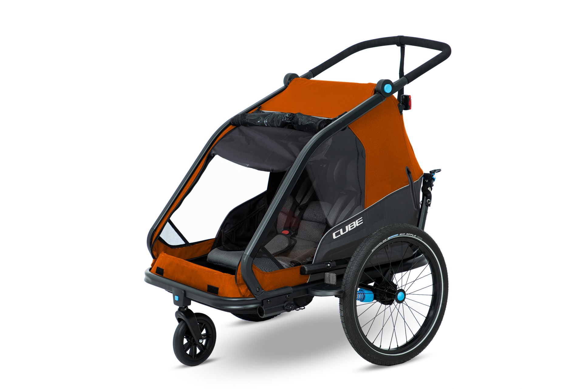 The CUBE Kids Trailer Double CMPT is the perfect everyday companion. This sophisticated multi-talent is a bike trailer and kids' buggy in one.