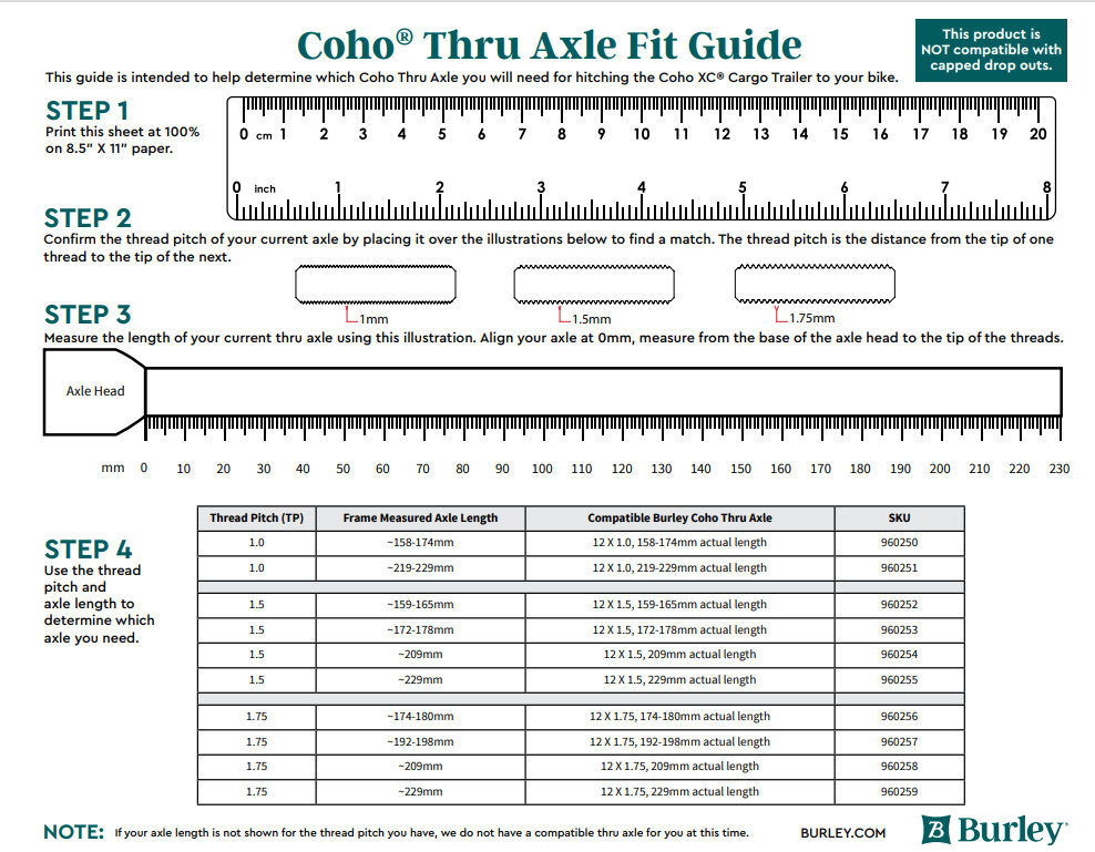 Enables connection of the Coho XC trailer to bikes with 12mm rear thru axles. Multiple thread pitches and lengths are available. Stock thru axles are not able to accommodate any sort of axle mounted hitch system. A Burley Ballz Thru Axle is required for any bike with a 12mm rear thru axle to use the Coho XC. The Burley Ballz Thru Axle is not compatible with all carbon fiber bike frames (consult manual).