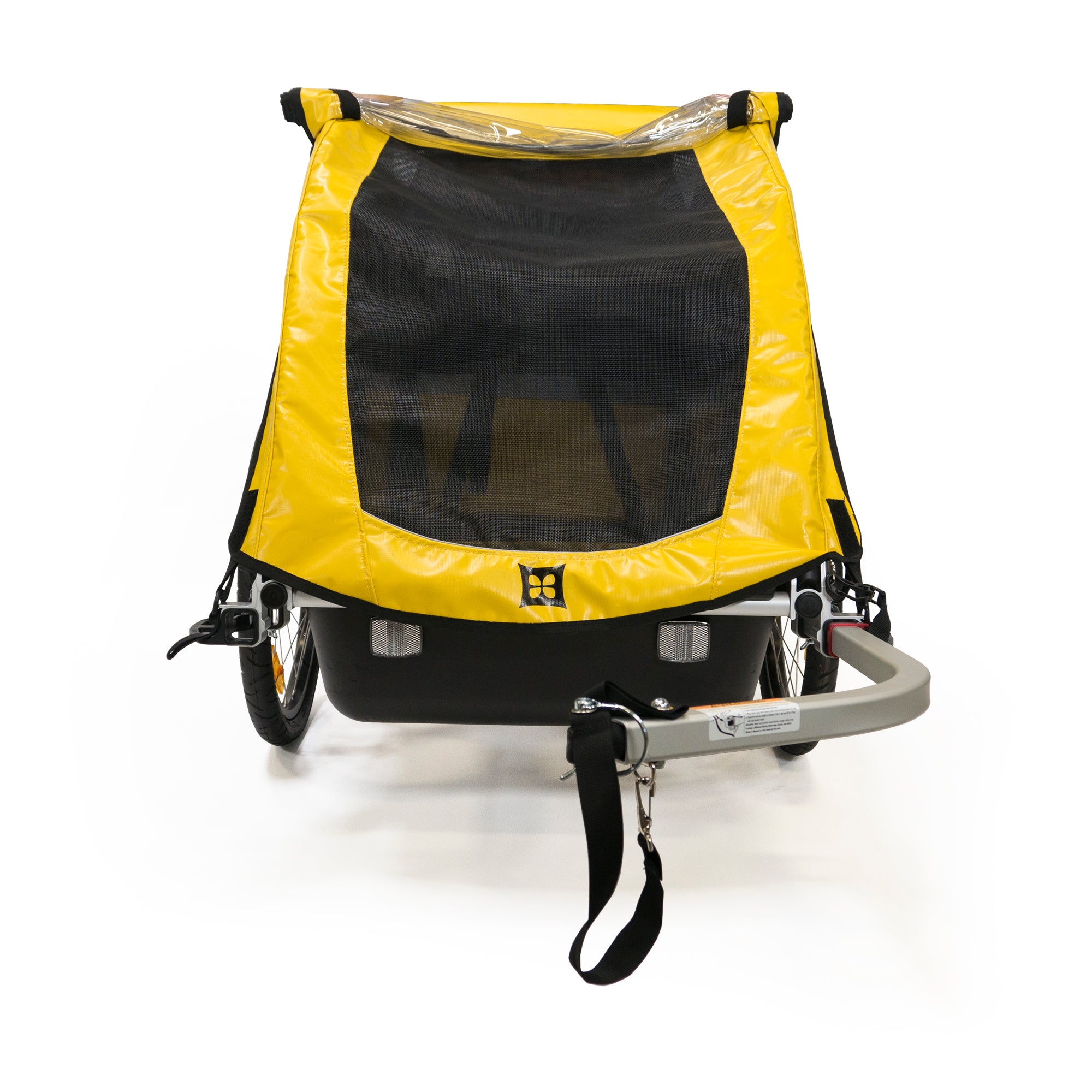 Equipped with two seats and a 5-point harness to safely transport children with ease. With a maximum weight of 45kg so there's plenty of room for two children plus luggage. Another feature is the tarpaulin cover meaning this trailer is waterproof, so even in the heavy rain, children can stay warm and dry.